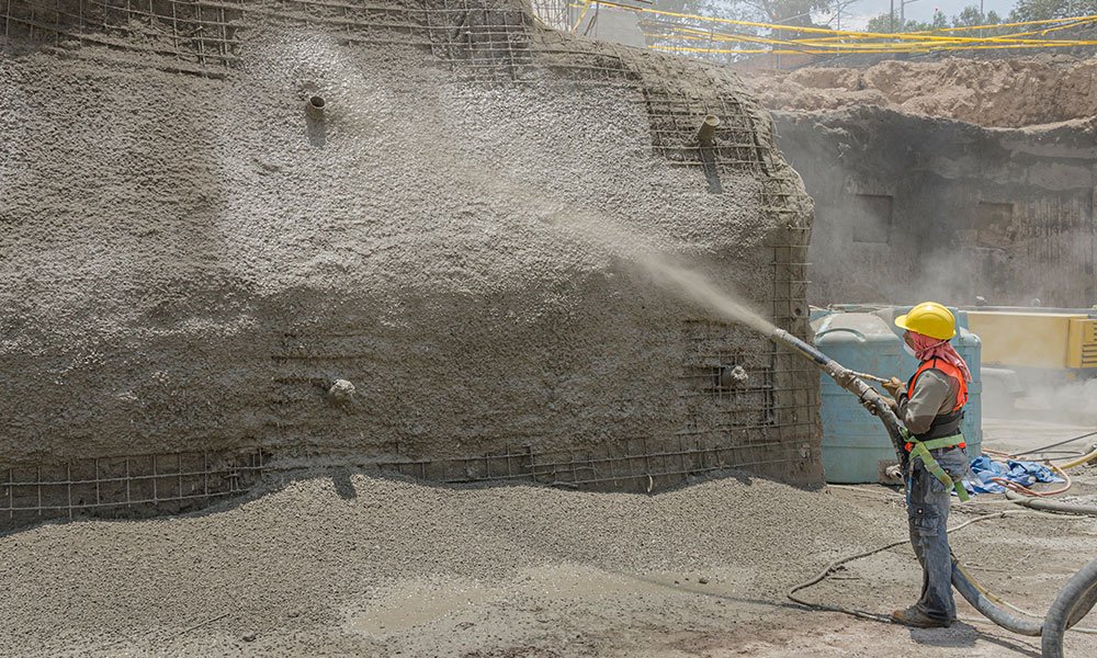 Proyectado a alta velocidad sobre una superficie, utilizado para estabilización de taludes, revestimiento de túneles y reparación de estructuras.